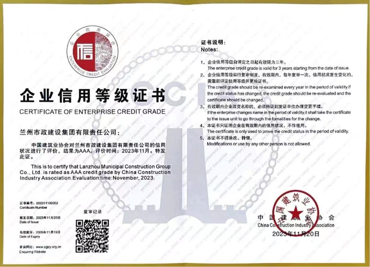 該信用評價(jià)由中國建筑業(yè)協(xié)會(huì)組織評定,旨在認(rèn)真貫徹落實(shí)國家信用體系建設(shè)要求,加快推動(dòng)建筑行業(yè)社會(huì)信用體系建設(shè),提高企業(yè)誠信意識(shí)和信用水平。評價(jià)結(jié)果分為AAA、AA、A、B、C五個(gè)等級?!敖ㄖI(yè)AAA級信用企業(yè)”是全國建筑業(yè)企業(yè)綜合能力最高評價(jià),是通過對企業(yè)基本素質(zhì)、經(jīng)營能力、財(cái)務(wù)指標(biāo)、管理能力及競爭力等五個(gè)方面指標(biāo)綜合考核而最終審定的建筑行業(yè)誠信經(jīng)營的標(biāo)桿企業(yè)。蘭州市政建設(shè)集團(tuán)于2009年獲評“中國建筑業(yè)AAA級信用企業(yè)”并保持至今。