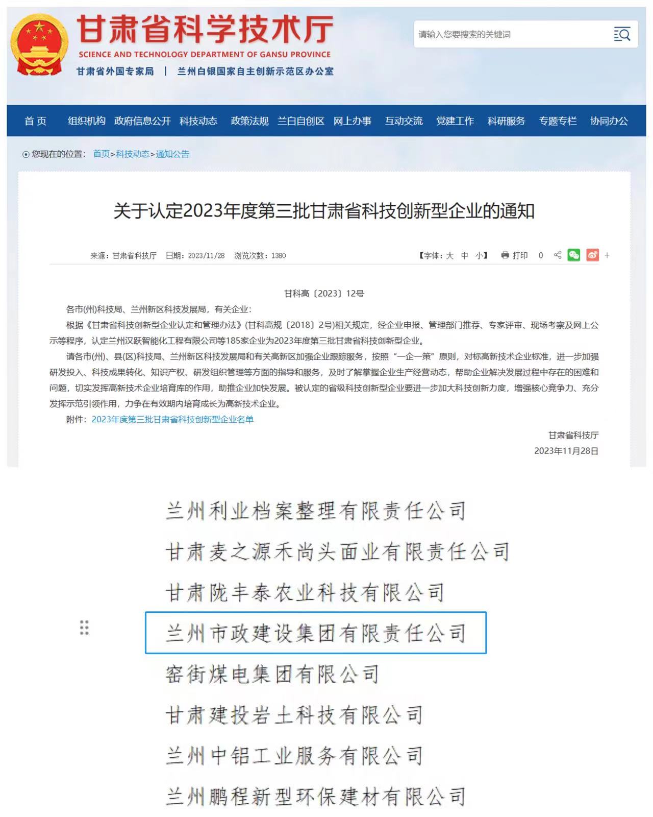 近日,甘肅省科技廳公布了2023年第三批甘肅省科技創(chuàng)新型企業(yè)名單,蘭州市政建設(shè)集團被認(rèn)定為“甘肅省科技創(chuàng)新型企業(yè)”。